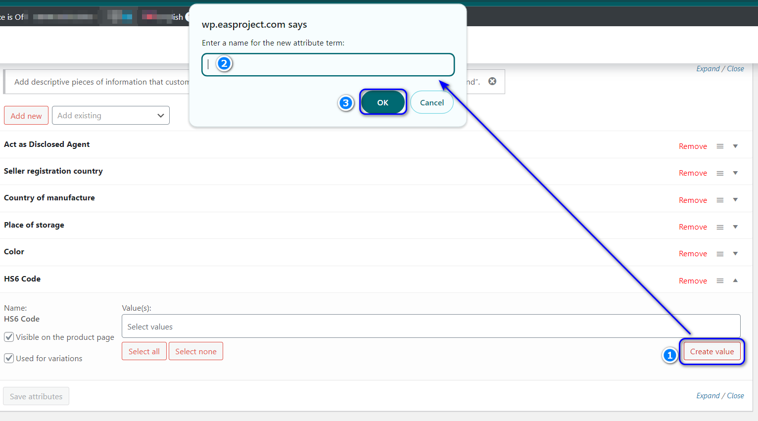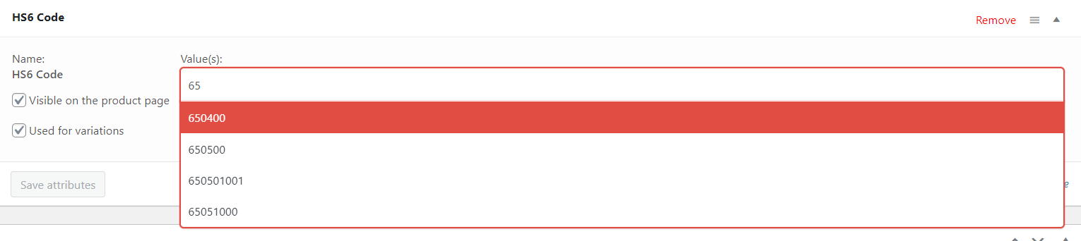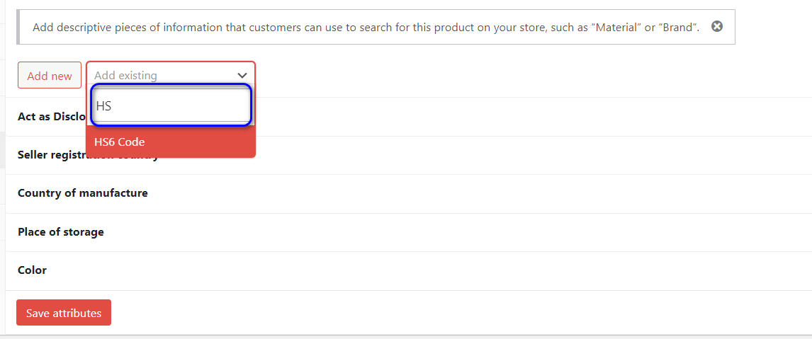 3. If there is no HS CODE attribute, create one by selecting HSCODE line from Custom product attribute dropdown control and pressing the button “Add”, otherwise go to item 4