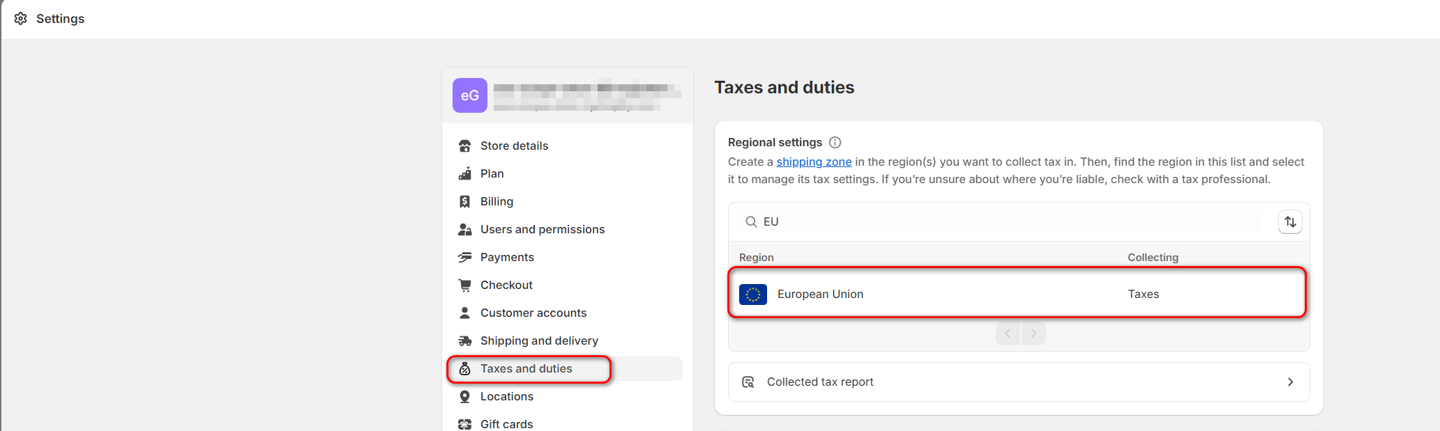 - Look up Shipping to the EU section and click Collect VAT