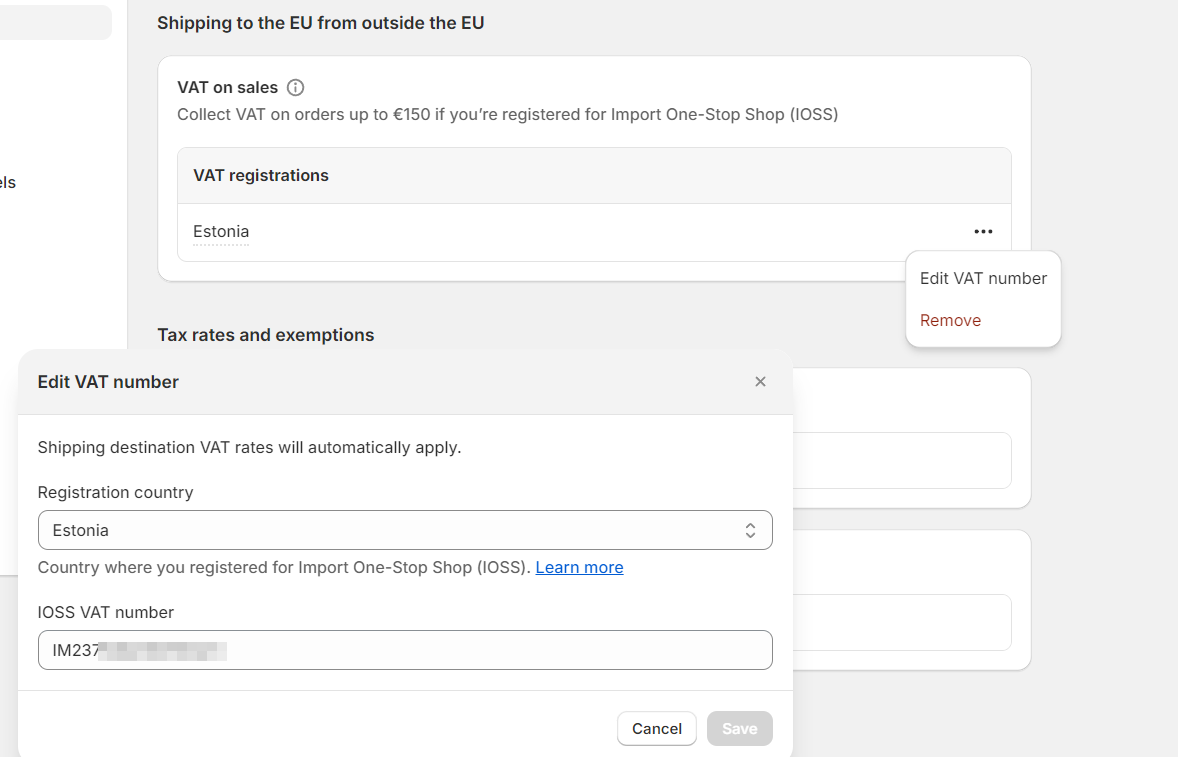 Now you just added IOSS registration to your store. Starting from now on, all orders under 150€ fulfilled from outside of EU countries will be considered and calculated as IOSS orders.