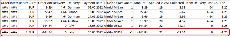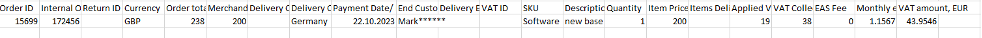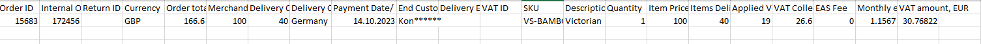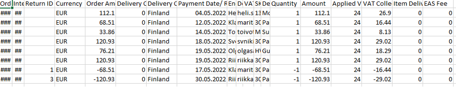 Above one can see a domestic sales report for Finland, please note that two lines at the bottom represent returns. B2B domestic sales are included into the EAS domestic sales report.