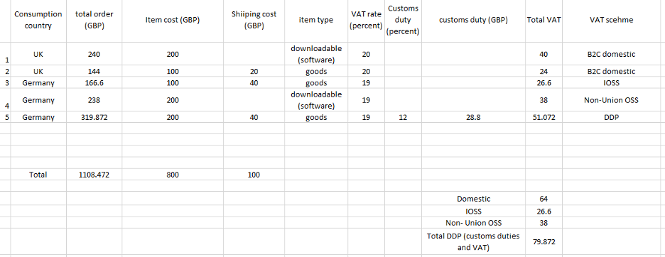 Example used here is for a UK based merchant using both IOSS and Non-Union OSS Schemes and also sends orders over 150 EUR as DDP, customs duties and VAT is collected for such orders. For simplicity all sales are in GBP