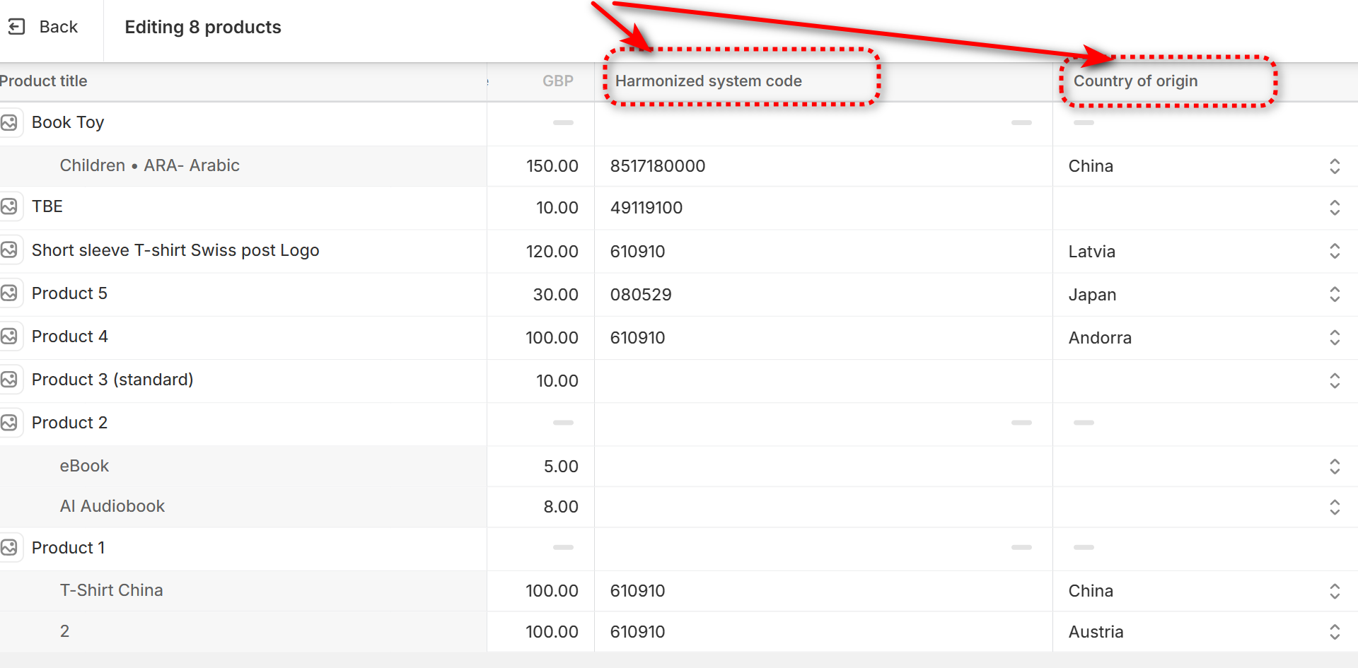 In the catalogue view go to "Columns" , open the fold down menu and enable "Harmonised system code" and "Country of origin" :