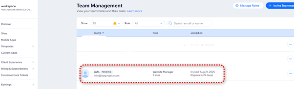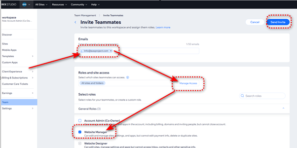 To provide access to your store you need to access your Wix studio and add EAS as a team member to your store: