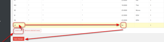 - Create a new tax line for the destination country by pressing “Insert row” button and adding the destination country code