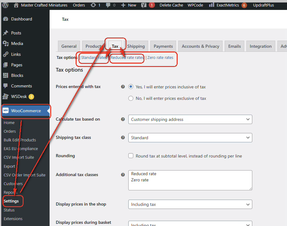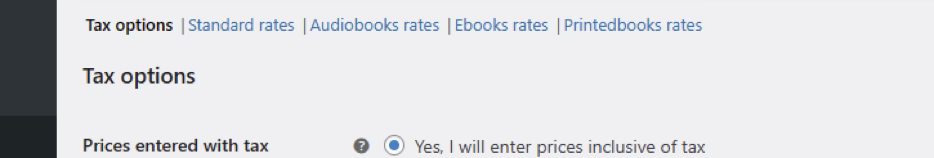 Go to administrative menu , choose “WooCommerce” , “Settings” , “Tax”, open tax options “Standard rate” , “Reduced rate” , “Zero rates” (note that the name of the tax options may vary from store to store and can be named “Books” , Printed books” , “Audio books” etc. depending on the sold merchandise)