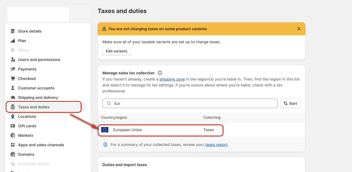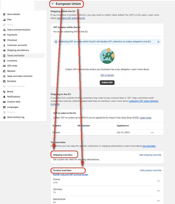 In the EU Section you will be able to see the overrides. Note that overrides may be product (there may be more than one sequence of product overrides in the store) or shipping ones. All overrides that exist in the store should be checked and corrected.