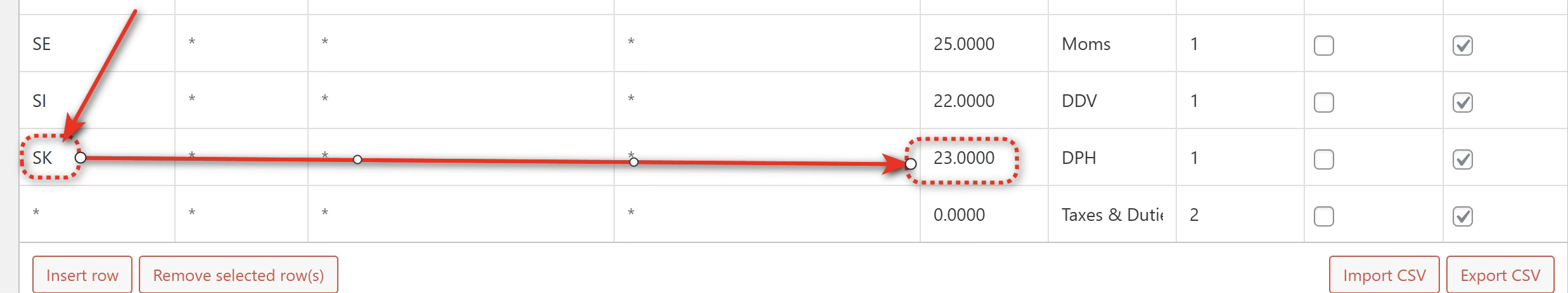- In “Standard rates” tax option, the rate for Slovak republic (country code SK) should be set to 23 percent rate..