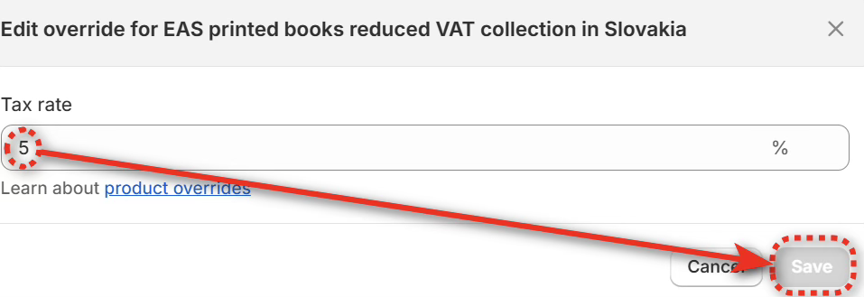 Repeat the operation on all Slovakia entries found in the overrides section (you may have up to 4 sets of overrides for Slovakia – for shipping, printed books, E-books and Audio books) .