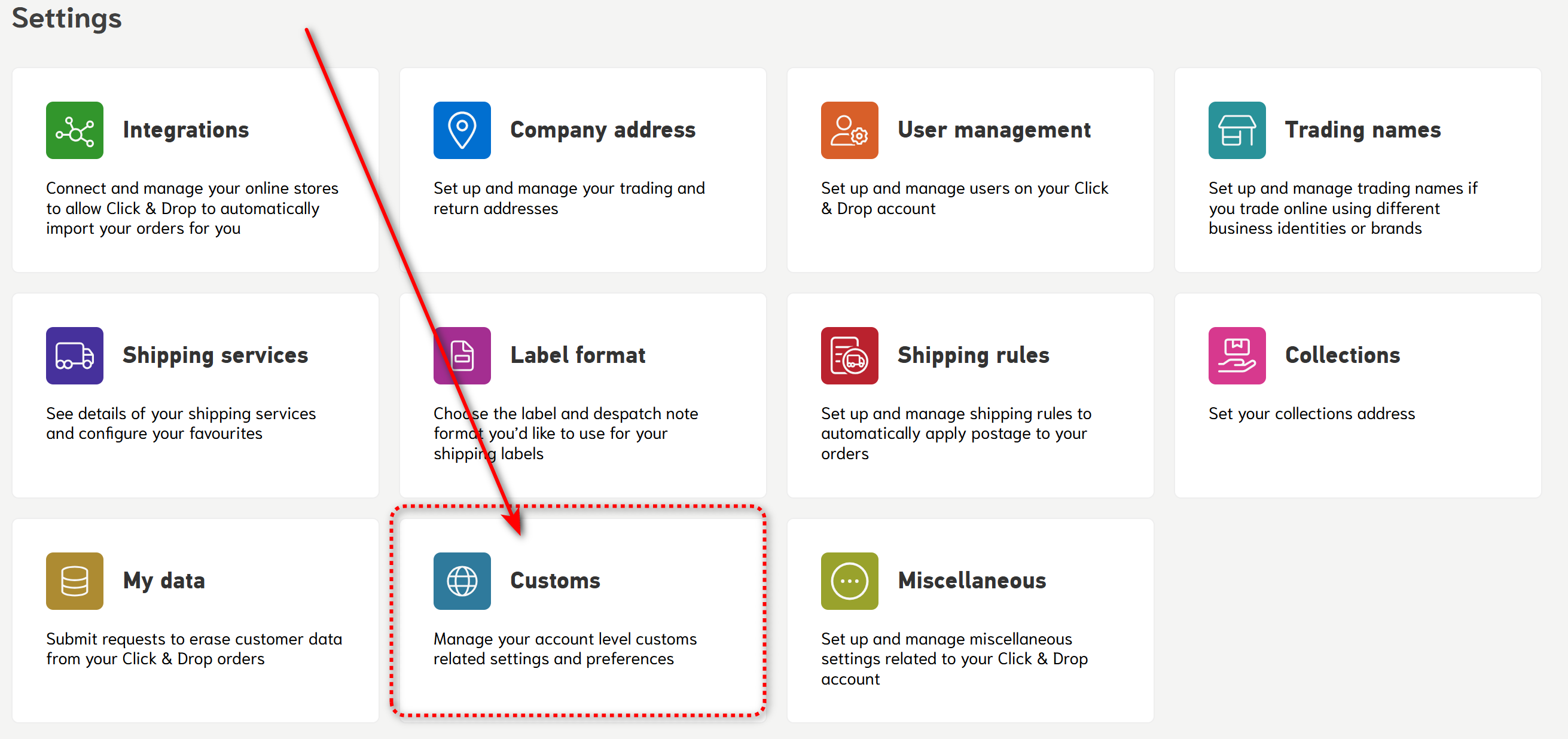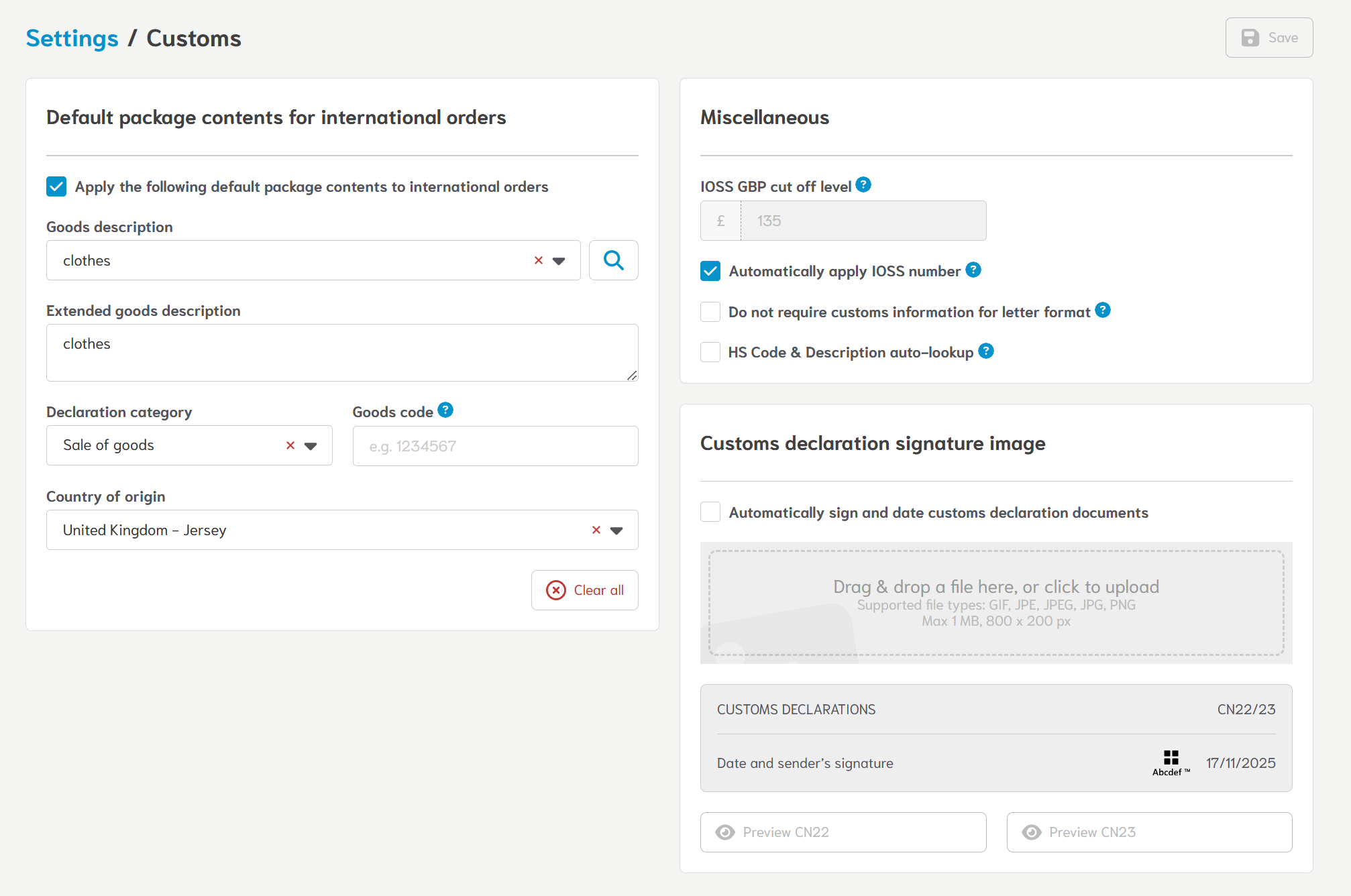In addition to entering your IOSS number you also need to input IOSS limit into the Customs section of the Settings. Go to the Settings in the upper right corner of the Click & Drop dashboard and go for "Customs" menu group: