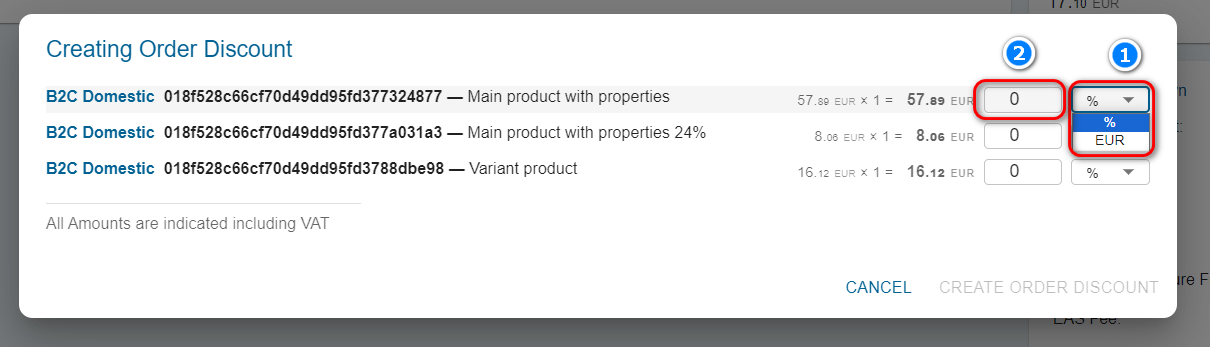 - In the dialog window for each item provide the desired discount amount, either as a percentage or a fixed amount.
