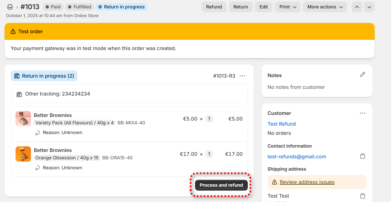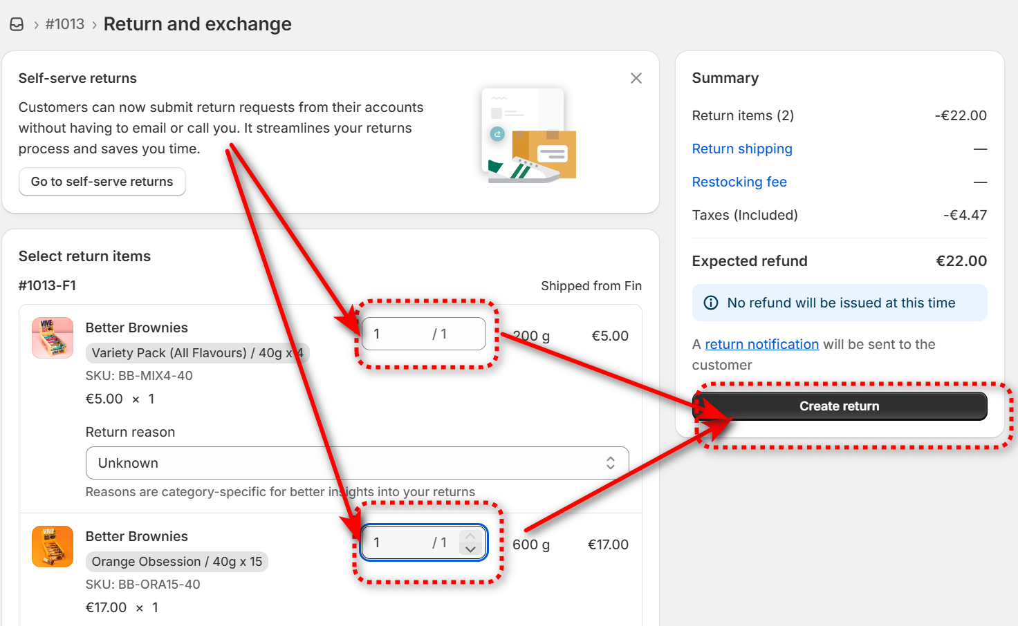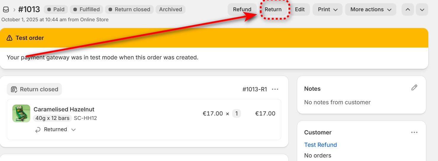 If an order is returned by the logistics provider or customer, regardless of the reason, you must perform a return in your Shopify store. Return can be performed with and without refund. Naturally, orders that are refunded are clear cases of returns and if you want to send other items to the customer in exchange of returned items the case becomes an order exchange.