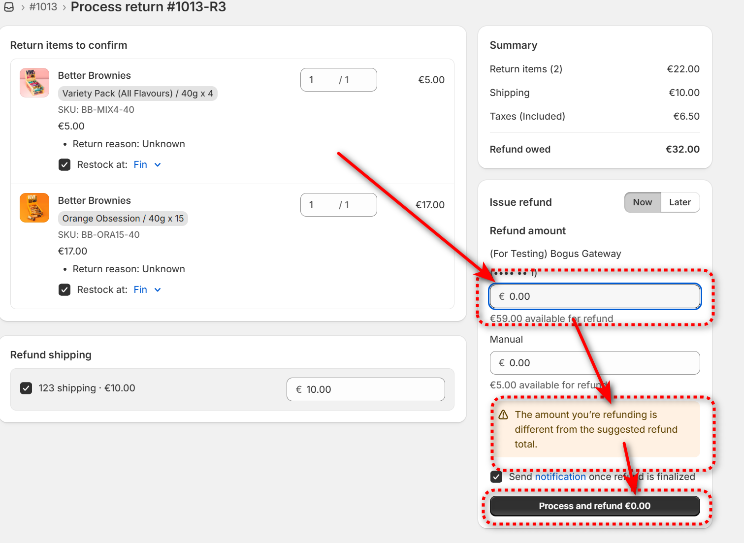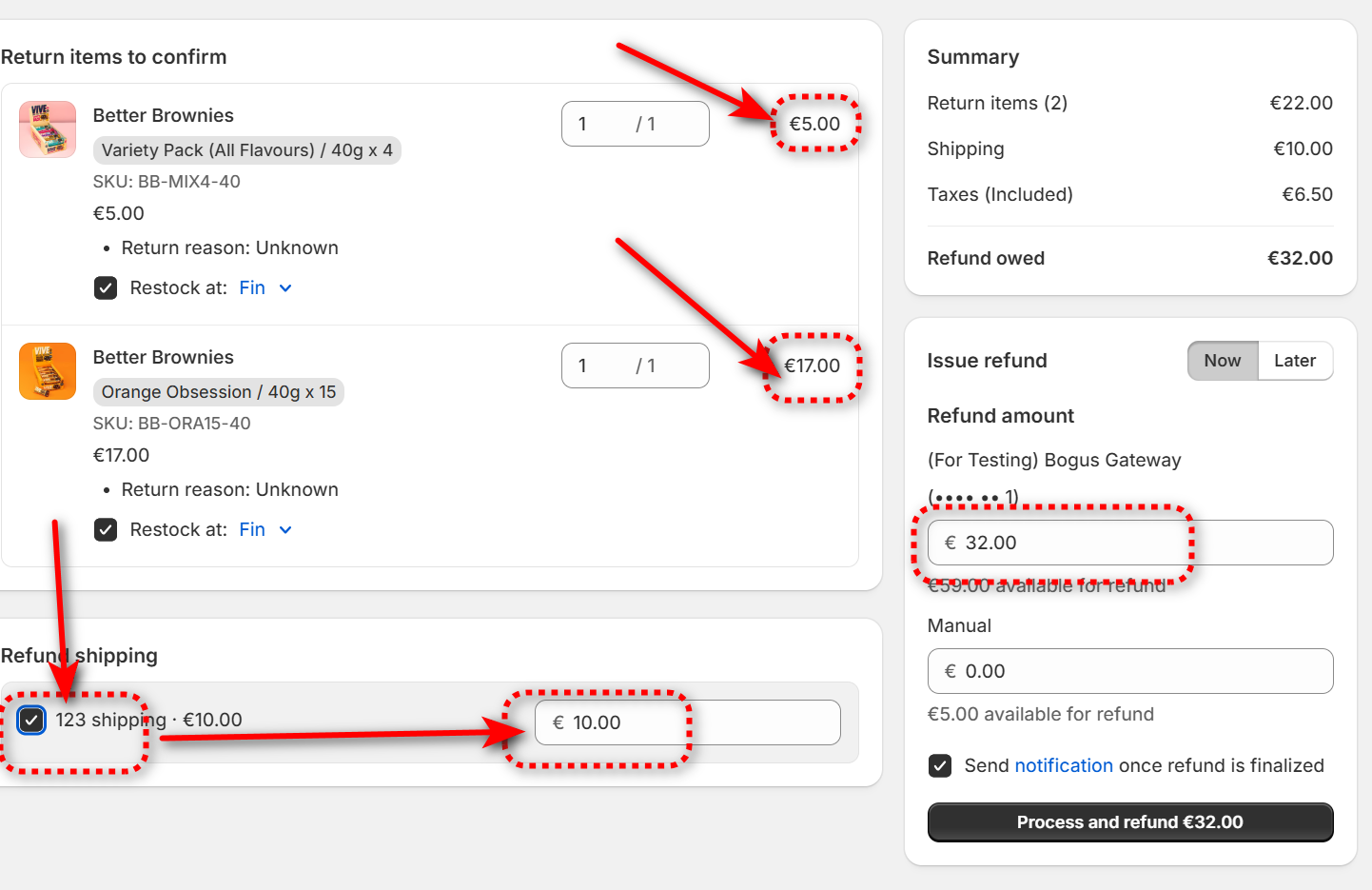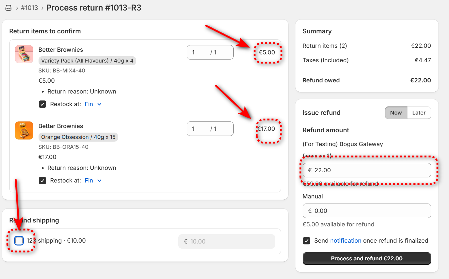 Press "Process and refund". New view will be shown. You can choose whether you want to refund the customer (automatically or manually) . Shopify would calculate the refund sum automatically (22 EUR in the example) , if you choose to refund shipping it will be added to the automatically calculated sum (32 EUR see further example) :