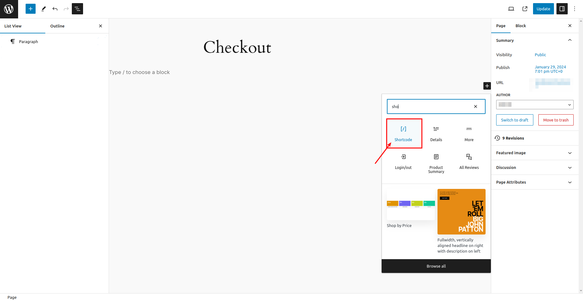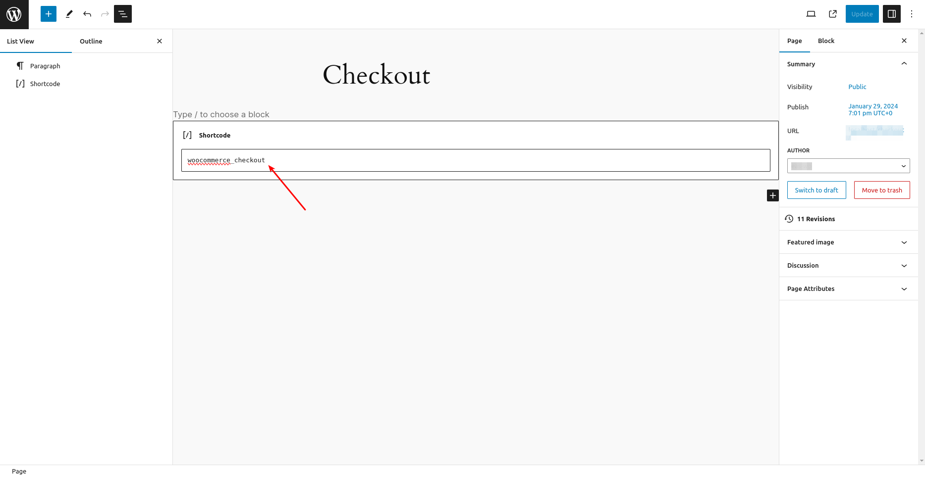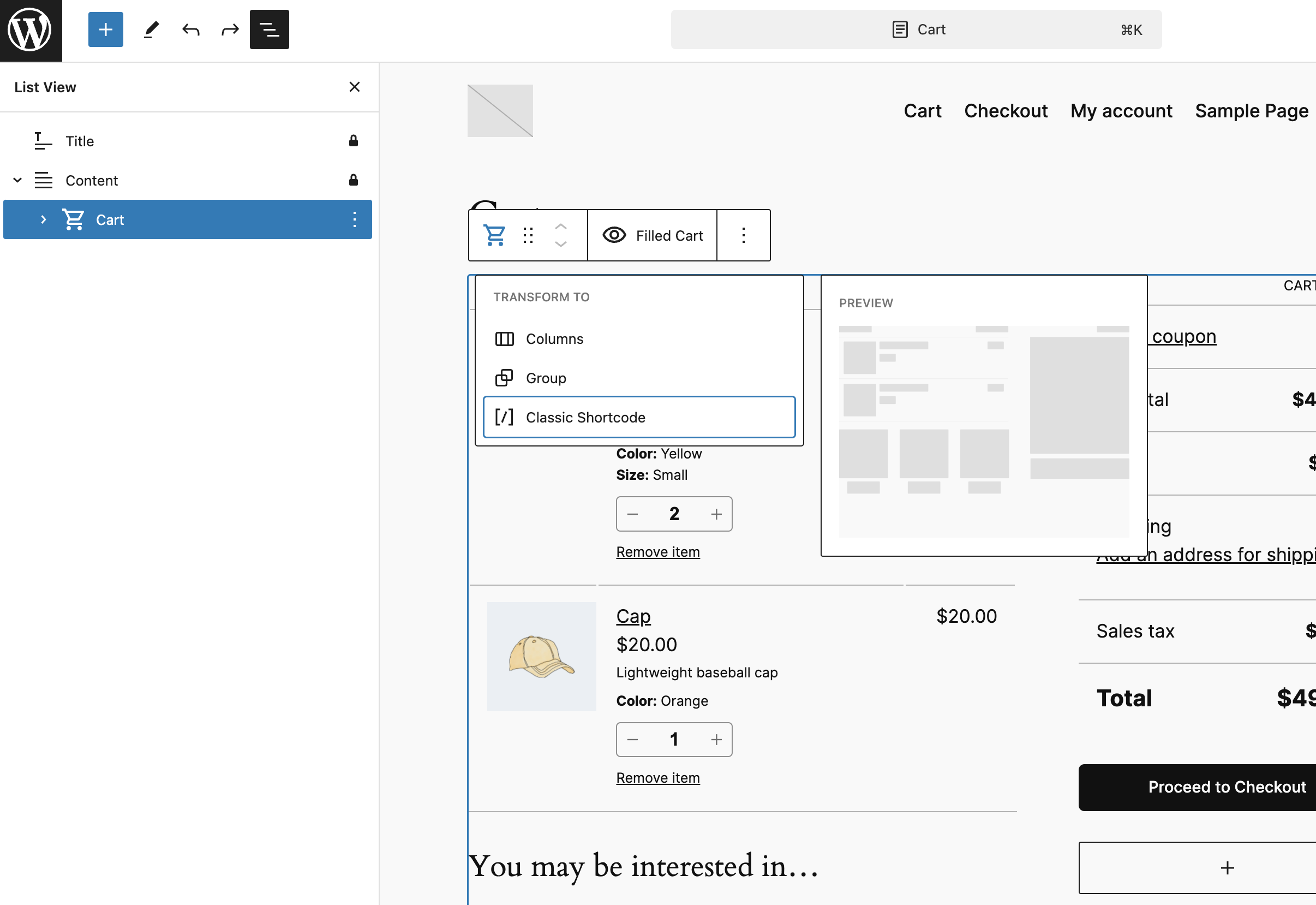 Using a non-block theme: Go to Pages -> All Pages, and then locate and edit the Cart/Checkout page. - Open the List View and select the Cart or Checkout block.