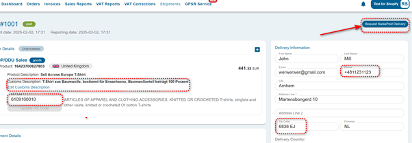 German customs description, HS code, post code and customer phone number can be changed as many times as needed before the label is requested.