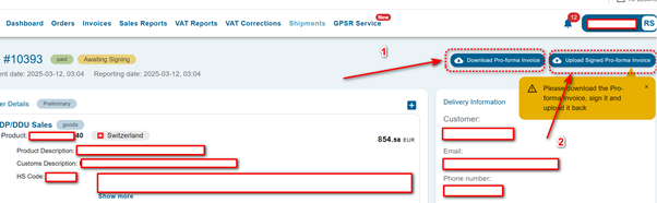To prepare the pro-forma invoice download it by pressing button (1) and then upload the signed and scan document by pressing button (2).