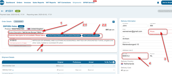 The EAS Dashboard provides instant feedback on data validation. If the phone number or the post code is not correct, EAS will not allow for the order to continue until the data is corrected manually.