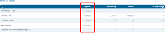 Shipment Details: Displays customs duties calculations at three stages:
