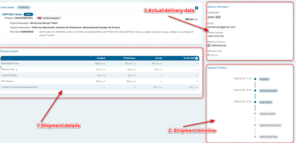 - Shipment Timeline: Shows key delivery events.