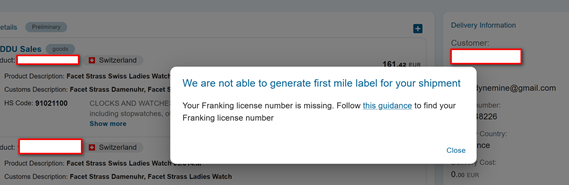 Until the Franking license number is provided it is not possible to print First Mile Label via EAS dashboard. Pressing the button “First Mile label” before the Franking license number is provided will produce the following notice: