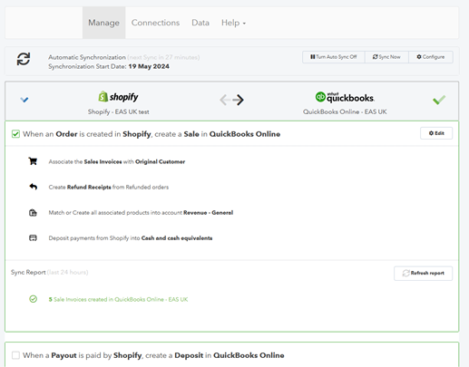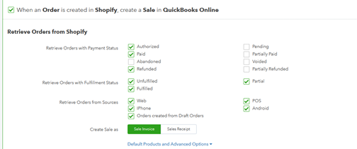 Make sure that the first option (“When an Order is created in Shopify , create a Sale in QuickBooks Online”) is enabled :