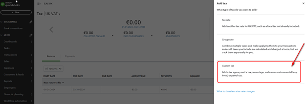 - Select "Custom tax" and input settings for the new tax agency.