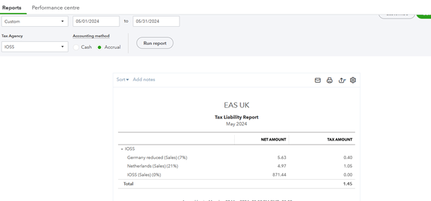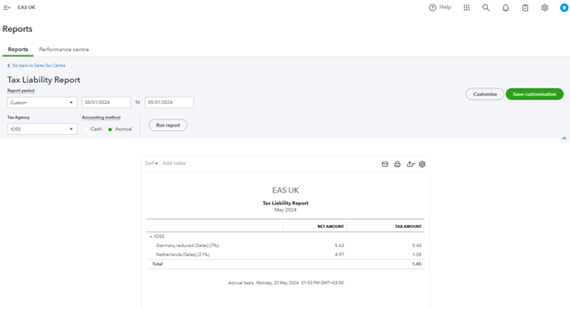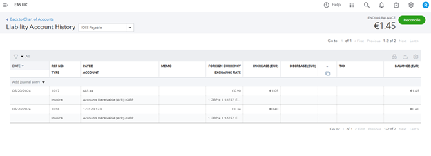 QuickBooks applies current or set exchange rates, which might differ from the IOSS report if they are made in currencies other than your default currency. That may lead to the exchange rate difference between the booked value and the IOSS report. In the IOSS report EAS will use the exchange rate applicable on the last day of the reporting period. Exchange rate difference should be adjusted manually when the IOSS VAT account is closed monthly.