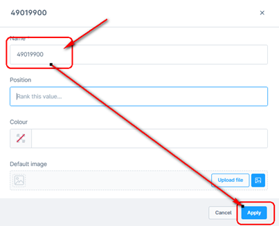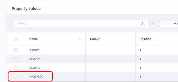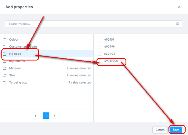 - Choose the property intended for HS codes and mapped as such in the EAS extension , press on it and choose the value (values can be added as explained in Section 2. Press “Save”