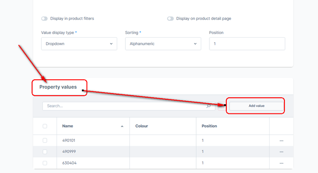 Add all necessary values to the newly created property. One can always add additional values at a later stage. Press button "Add value"