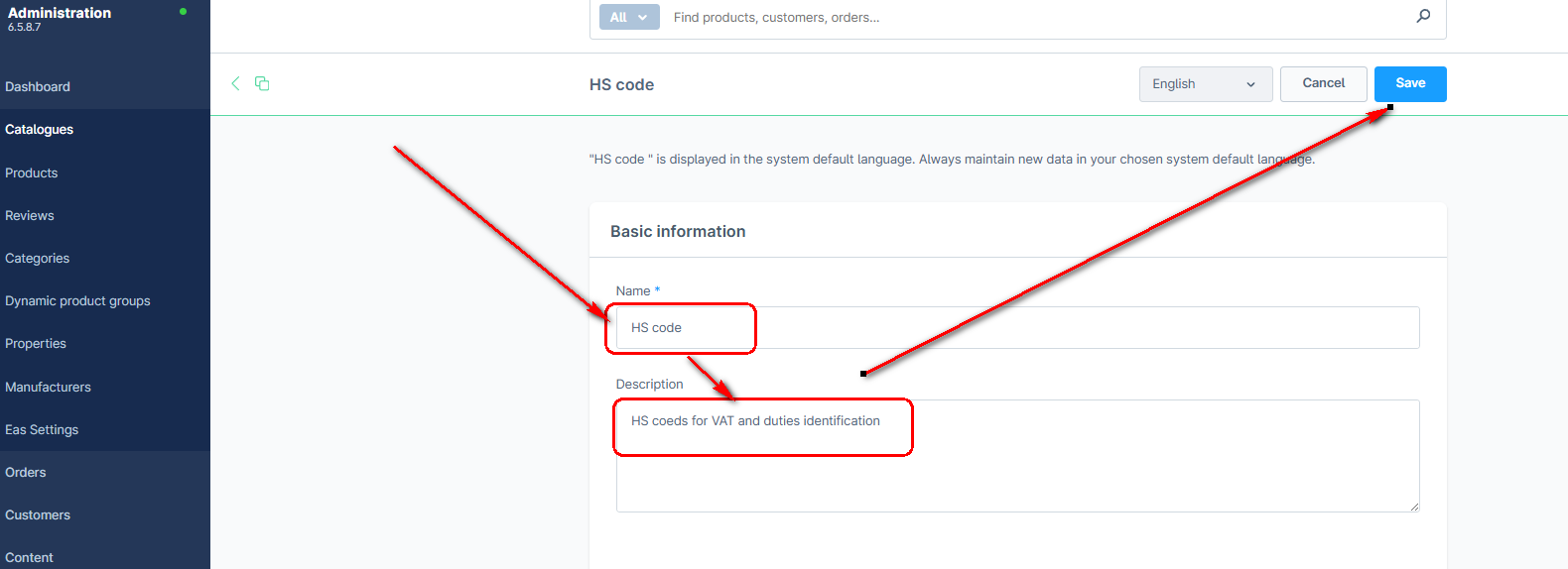 To set up HS codes for your items in Shopware 6 to enable DDP calculation one needs to create a special item property (item attribute) for the store inventory, map that attribute in the EAS extension and assign value from the attribute to the products.