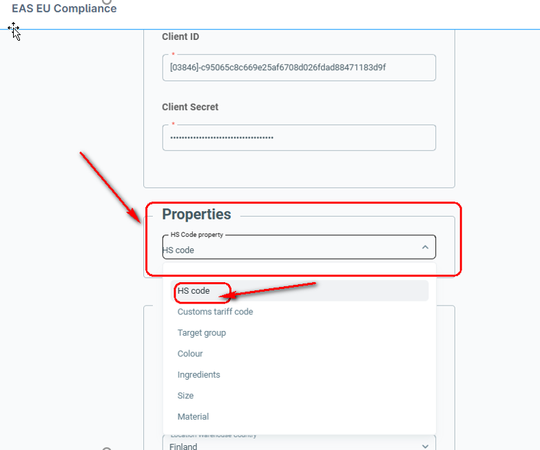- Find option “Properties” and choose the name for the property that you created for HS codes in your store (“HS code” in the example)