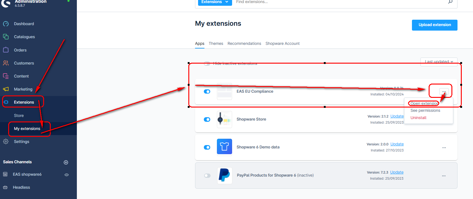 - In the administrative menu find the option “Extension” > “My extensions”. Choose EAS EU Compliance extension and press on the three dots button to open the extension