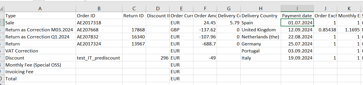 | Monthly Exchange Rate | Exchange rate from order payment currency to EUR used in the fiscal report as per EU legislation. (Exchange rate at the last working day of the reporting month) |