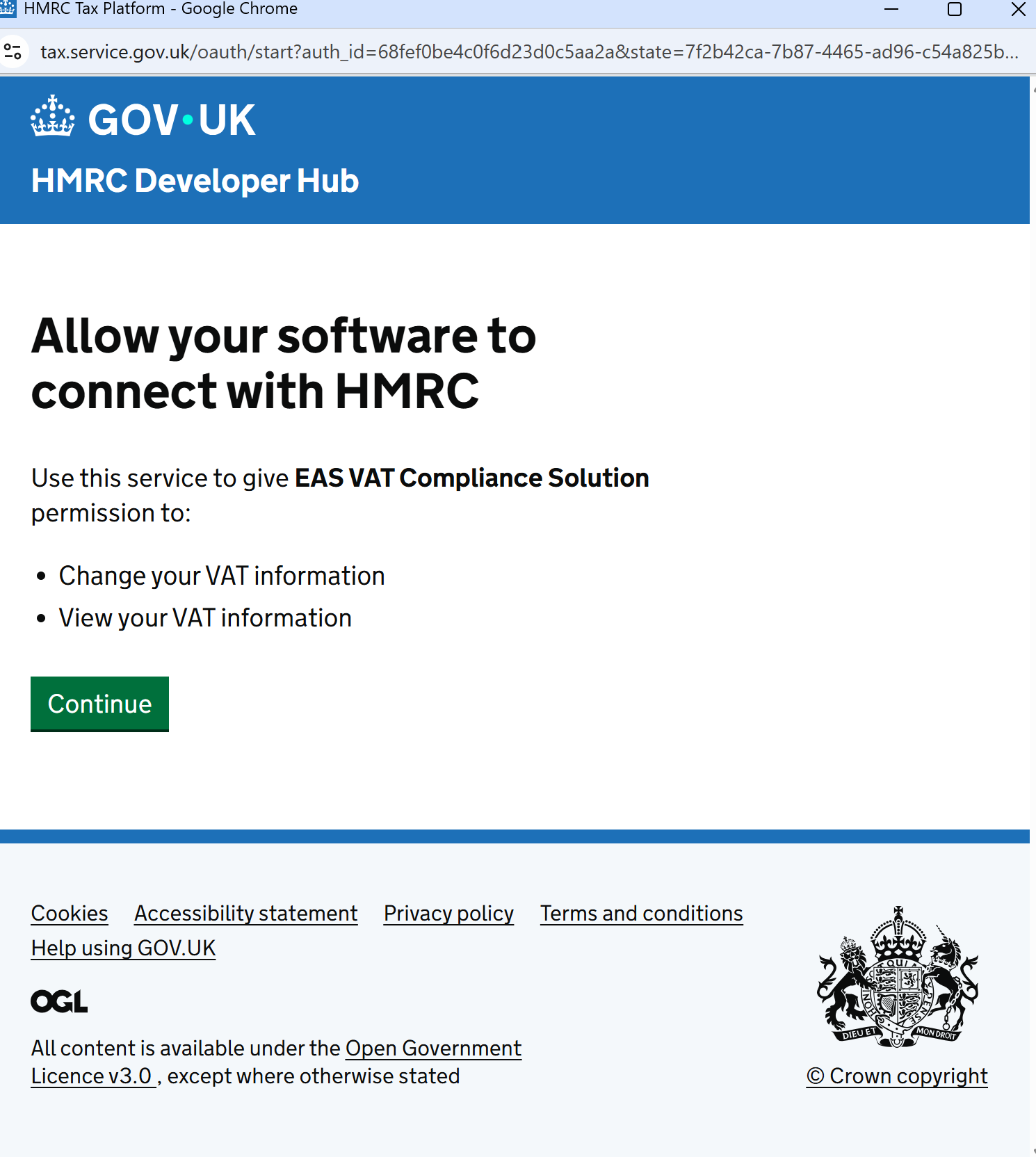 In order for EAS to be able to file your UK VAT reports you need to connect your UK VAT account to the filing solution developed by EAS.