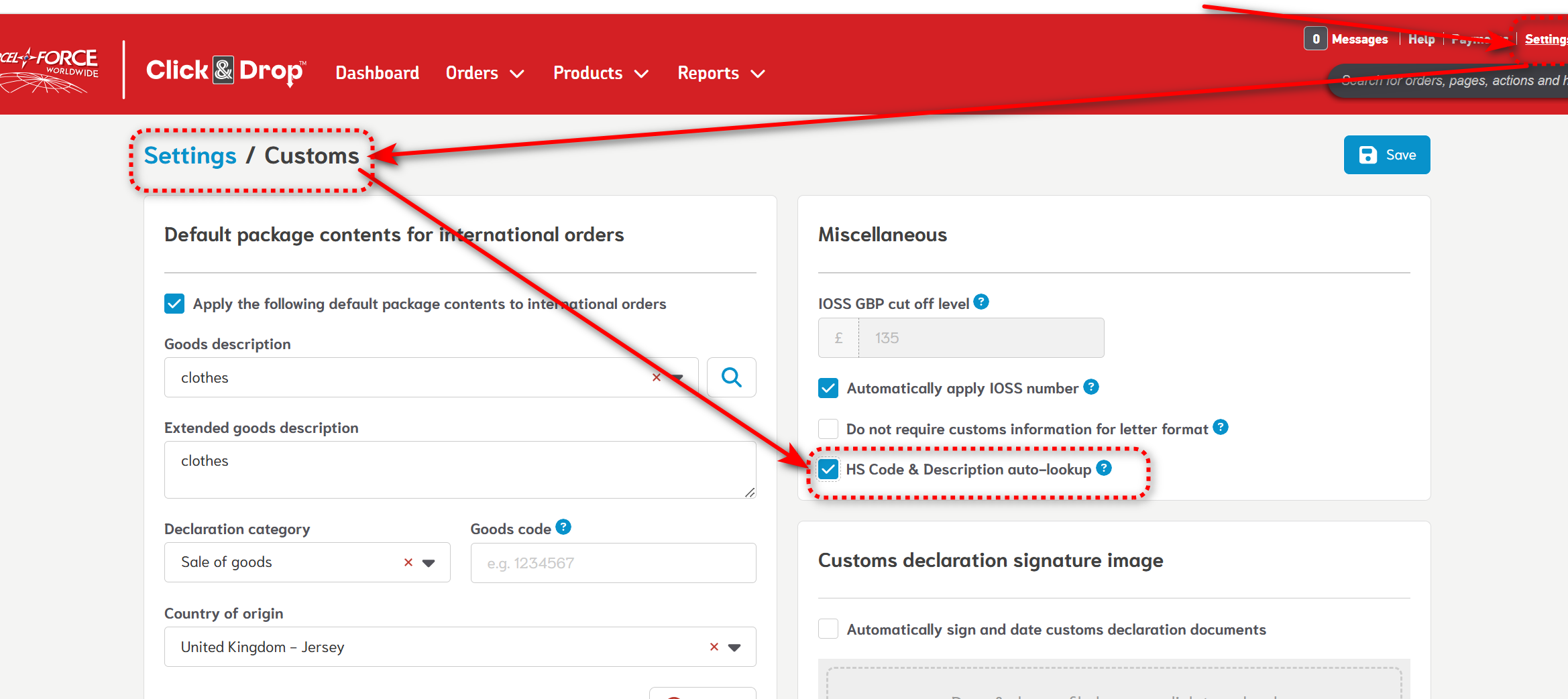 Click & Drop has automated function that allows for automated lookup of HS codes with the help of a third party solution. To enable that option , please , tick the box in the "Customs" settings :